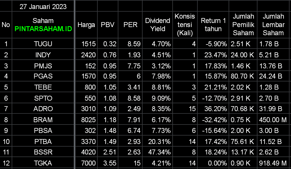 | Saham | Hari Bursa | Harga | PBV | PER | Start Entry |
