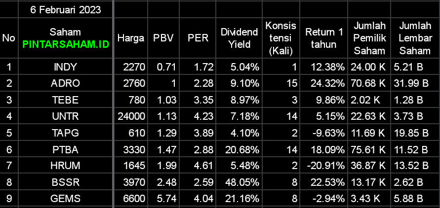 | Saham | Hari Bursa | Harga | PBV | PER | Start Entry |
