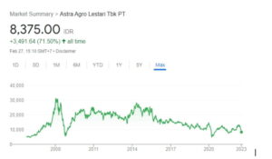 Setelah itu harga saham AALI turun dan belum pernah mencapai level tertingginya bahkan ketika CPO sedang boomingnya di tahun 2021 kemarin