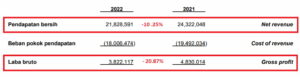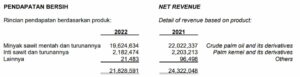 Jika dilihat lebih rinci lagi, penurunan laba bersih perusahaan berawal dari turunnya pendapatan. Berdasarkan produknya, pendapatan dari minyak sawit mentah dan turunannya menurun dari Rp22,02 triliun menjadi Rp19,26 triliun atau turun 10,88%. Selanjutnya dari produk inti sawit dan turunannya juga turun dari Rp 2,20 triliun pada 2021 menjadi Rp 2,18 triliun pada 2022 atau menyusut -0,94%.