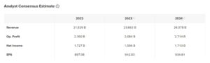 Jika kita melihat konsensus para analis melalui Stockbit, diketahui bahwa para analis memproyeksikan pendapatan perusahaan di akhir tahun 2023 mencapai Rp23,66 triliun atau berpotensi tumbuh 8,40% dan laba bersih mencapai Rp1,59 triliun atau menyusut -10,94% dibandingkan tahun 2022.Â