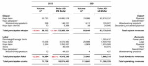 Tercatat volume ekspor di tahun 2022 hanya sebanyak 56.132 m3 atau menyusut -30,39% dibandingkan tahun sebelumnya sehingga pendapatan ekspor pun menurun dari USD 63,73 juta menjadi USD 53,95 juta atau turun -15,53%.Â