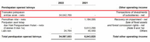 Jika dilihat lebih detail lagi, pendapatan besar tersebut datang dari transaksi pelepasan entitas anak. Dari transaksi itu perusahaan meraih dana sebanyak USD 34,04 juta.
