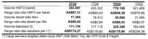 Harga rata-rata HSFO pada triwulan ini lebih tinggi 2% dibandingkan triwulan sebelumnya. Namun kenaikan ini diimbangi oleh penurunan harga rata-rata diesel dan batu bara, yang masing-masing lebih rendah sebesar 2% dan 1% pada 2T24.
