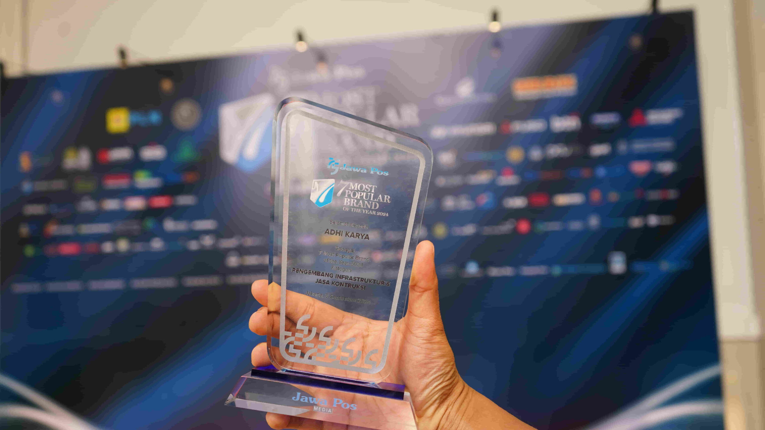 PT Adhi Karya (Persero) Tbk. (ADHI) kembali menerima penghargaan sebagai “7 Most Popular Brand of The Year 2024” pada kategori Pengembangan Infrastruktur dan Jasa Konstruksi yang diberikan oleh Jawa Pos pada Selasa (03/09) Balai Kartini Jakarta. Ajang ini dihadiri oleh CEO Jawa Pos Media, Leak Kustiyo, merupakan penganugerahan bagi 7 Brand Terpopuler untuk 60 kategori sektor pilihan hasil dari survei dan peratingan yang dilakukan oleh Jawa Pos bersama Infovesta. Penilaian 7 brand terpopuler dilakukan berdasarkan survei menggunakan metode multistage area random sampling dengan parameter top of mind awareness yang dijalankan di 20 Kota besar di Indonesia dengan melibatkan 19 ribu responden usia produktif. CEO Jawa Pos Media menyampaikan bahwa penghargaan yang diberikan ini memiliki nilai eksklusivitas yang tinggi