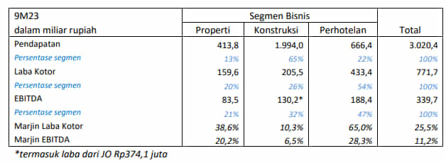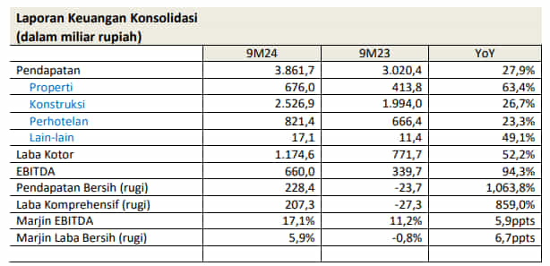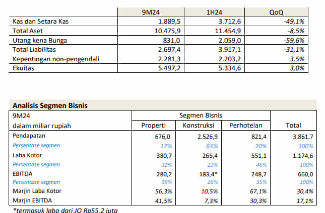• EBITDA 9M24 meningkat sebesar 94,3% YoY menjadi Rp660,0 miliar dari Rp339,7 miliar pada 9M23, sebagai hasil dari peningkatan EBITDA properti sebesar 235,7% (Rp196,7 miliar).
