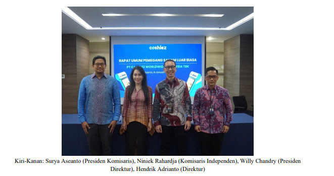 JAKARTA, 9 Januari 2025 – PT Cashlez Worldwide Indonesia Tbk (“Perseroan”) menggelar Rapat Umum Pemegang Saham Luar Biasa (“RUPSLB”) yang diselenggarakan pada hari Kamis, 9 Januari 2025, bertempat di Gedung Atria @Sudirman, Jakarta. RUPSLB tersebut menyetujui pengangkatan Willy Chandry sebagai Presiden Direktur Perseroan yang menggantikan Bapak Irianto Kusumadjaja. Perseroan berharap bahwa ini merupakan salah satu langkah yang strategis untuk meningkatkan kinerja Perseroan ke level berikutnya dalam rangka transformasi Perseroan dan membuat Perseroan semakin inovatif serta memberikan solusi pembayaran yang lengkap bagi pelaku usaha di seluruh Indonesia.